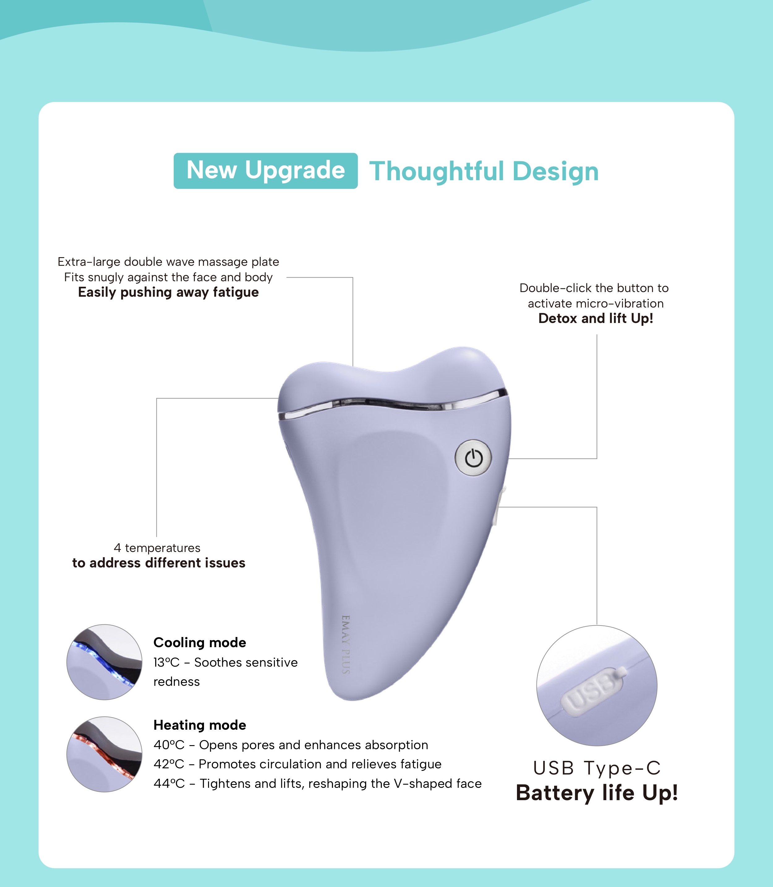 Equipped with warming (40°C–44°C) and vibration functions to enhance blood circulation and boost essence absorption, with three adjustable temperature settings to cater to skin needs. Additionally, it features a cooling function (13°C–15°C) to reduce puffiness, tighten pores, and soothe sensitivity. The large dual-wave massage head contours perfectly to the face and body, targeting lymph nodes and acupressure points with up to 8,500 vibrations per minute for effective lymphatic drainage. Achieve radiant skin, a sculpted V-shaped face, and sensitivity relief from the comfort of home.