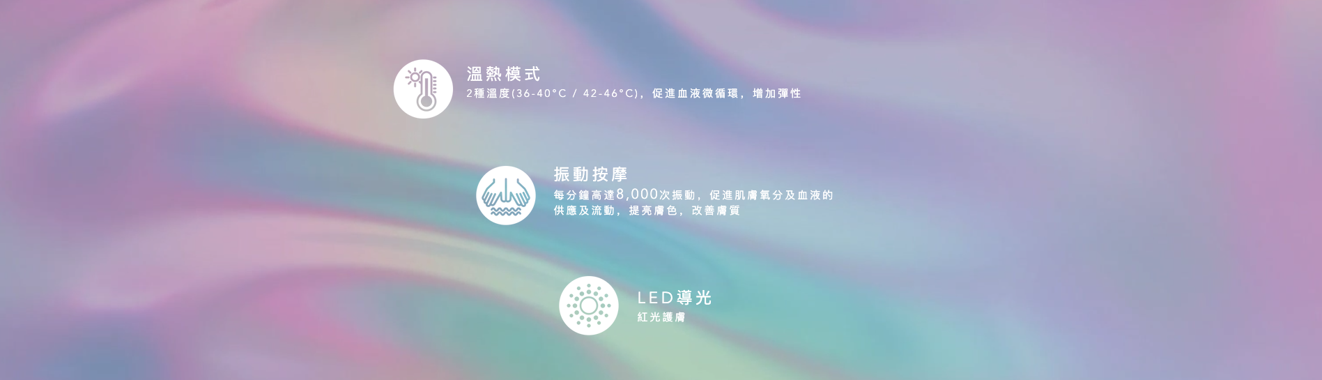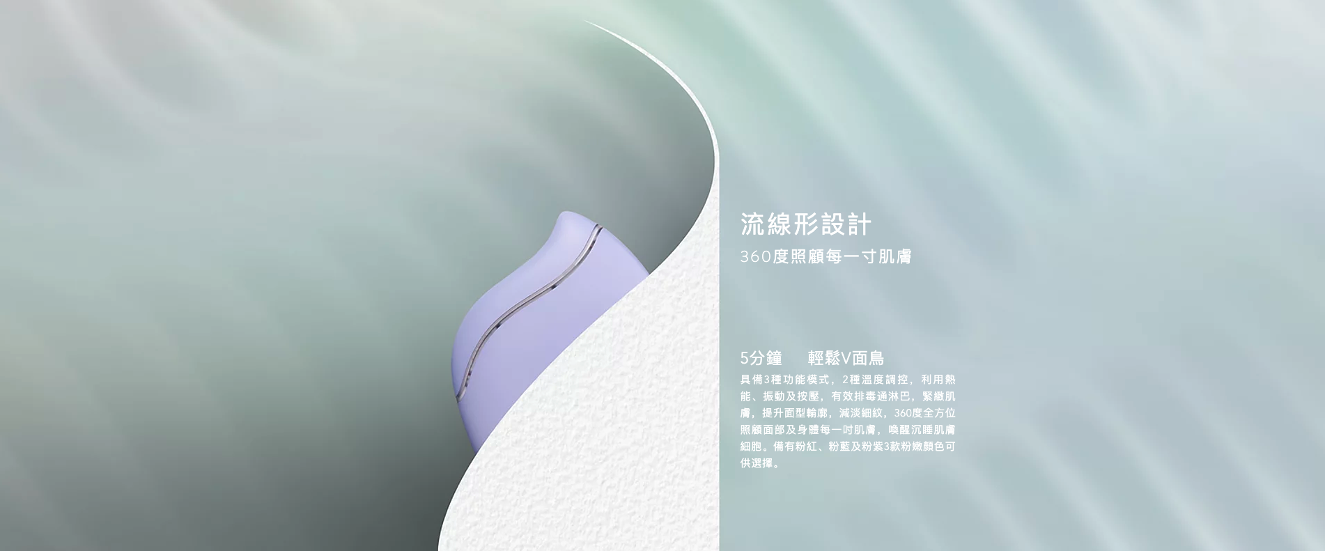具備3種功能模式,2種溫度調控,利用熱能、振動及按壓,有效排毒通淋巴,緊緻肌膚,提升面型輪廓,減淡細紋,360度全方位照顧面部及身體每一吋肌膚。每分鐘高達8,000次振動,喚醒沉睡肌膚細胞。